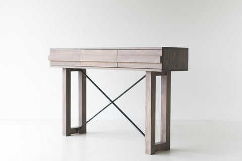 This Modern Console Table - Black and Brass - 0819 is made in the heart of Ohio with locally sourced wood. Each table is hand-made with solid black walnut and finished with a dark matte finish. The "x" is steel and is added for stability and aesthetic and is powder-coated in a beautiful brass color. We love this and hope you enjoy it as much as we do!